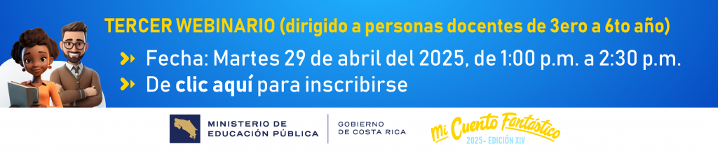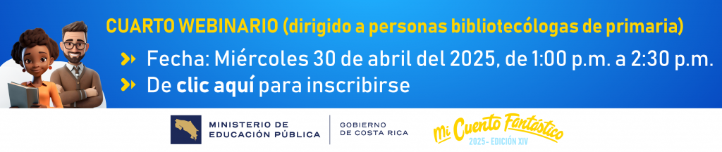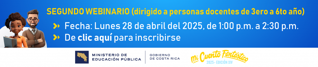 A continuación podrá inscribirse en los Webinarios «Mi Cuento Fantástico, Biblioteca virtual y escritura creativa», organizados por la Asociación Amigos del Aprendizaje (ADA) en conjunto con el Ministerio de Educación Pública: